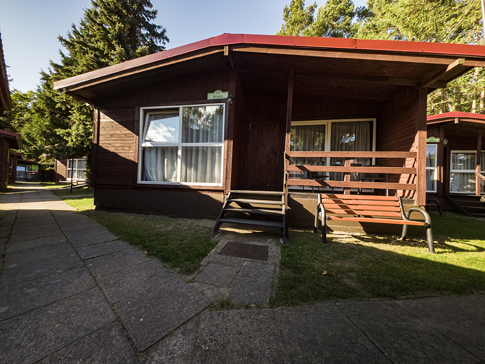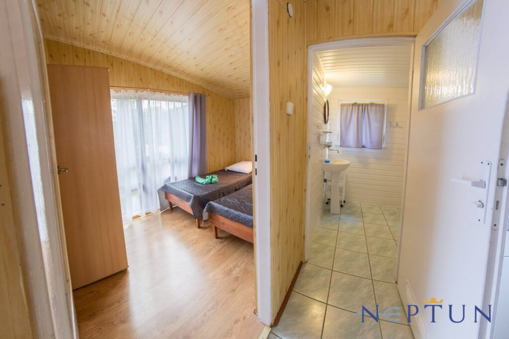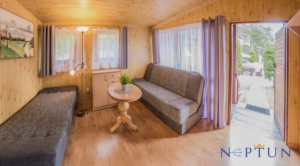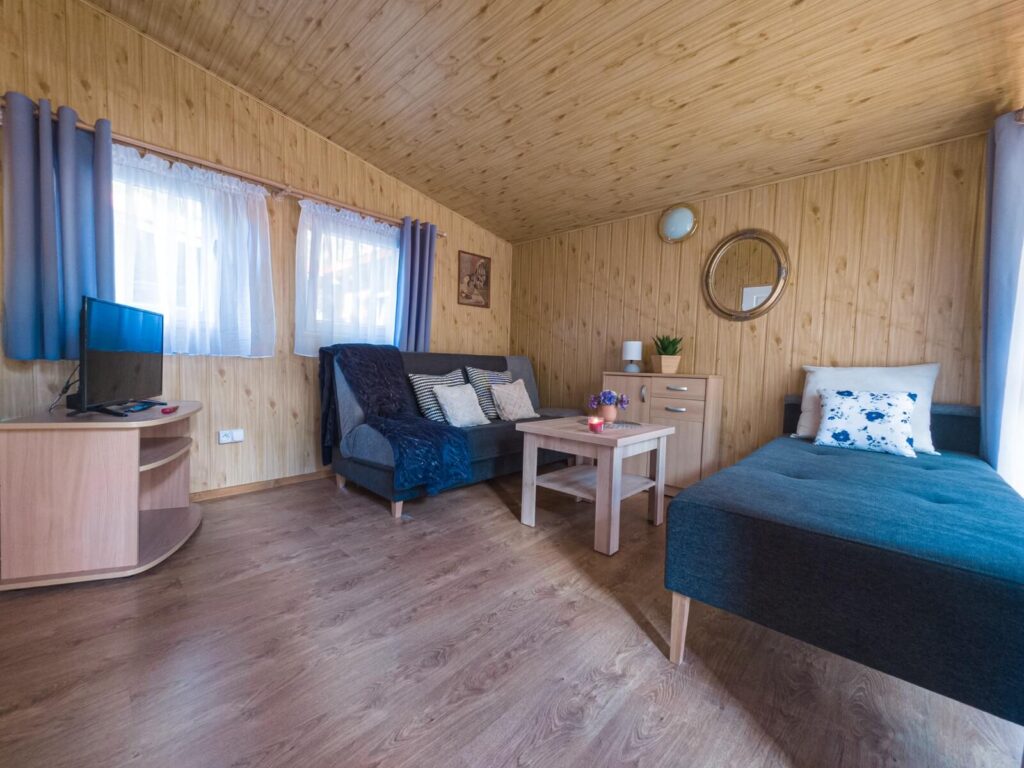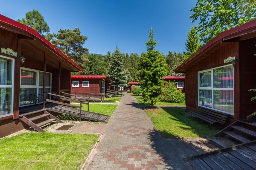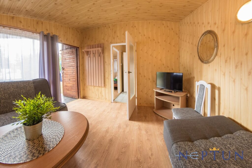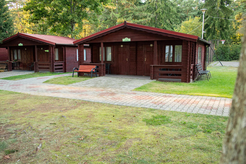 Jednorodzinne domki drewniane typu „Mikołajki”: dwupokojowe z łazienką, aneksem kuchennym z wyposażeniem (czajnik, lodówka, naczynia, sztućce), telewizorem LCD, sprzętem plażowym, tarasem oraz ogrodowym kompletem wypoczynkowym. Domki z podjazdami – dostępne dla osób poruszających się na wózkach inwalidzkich.
