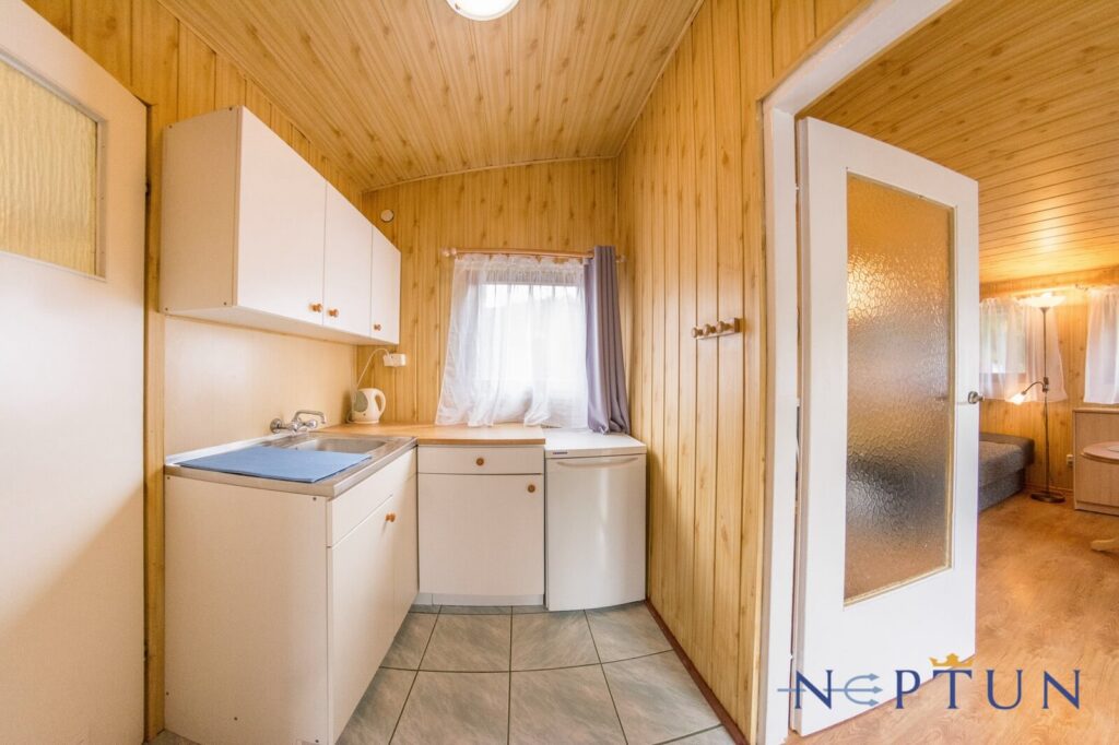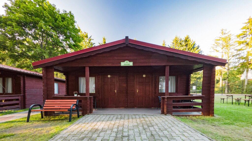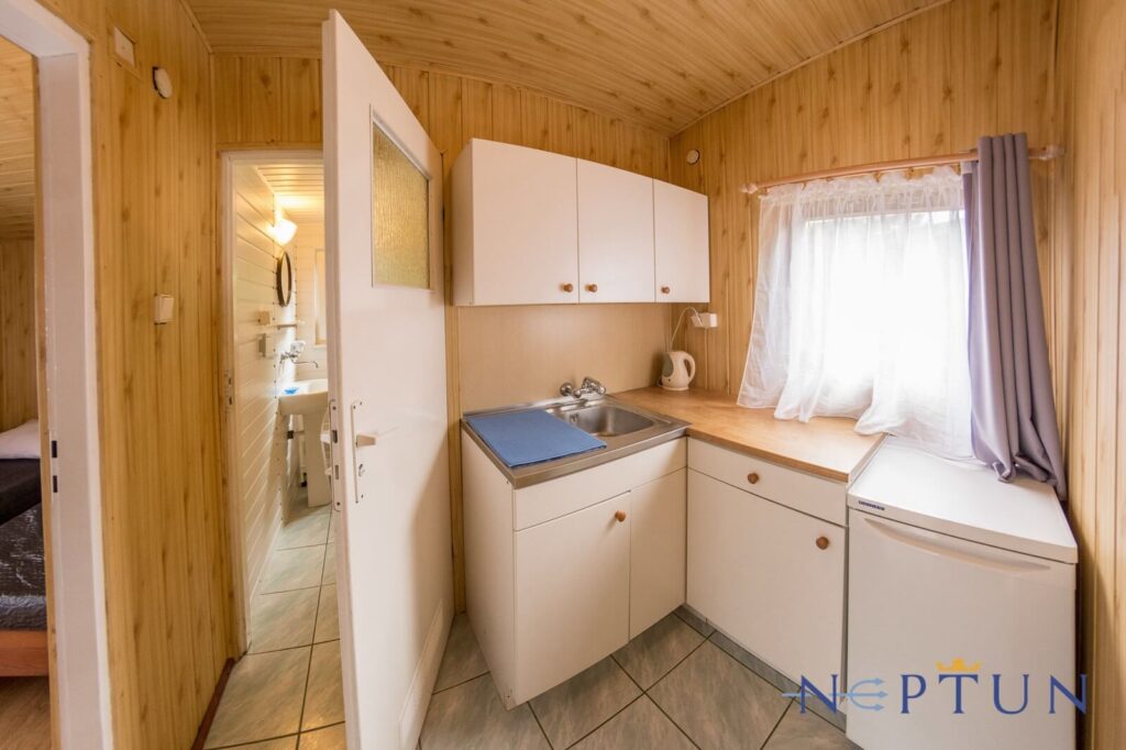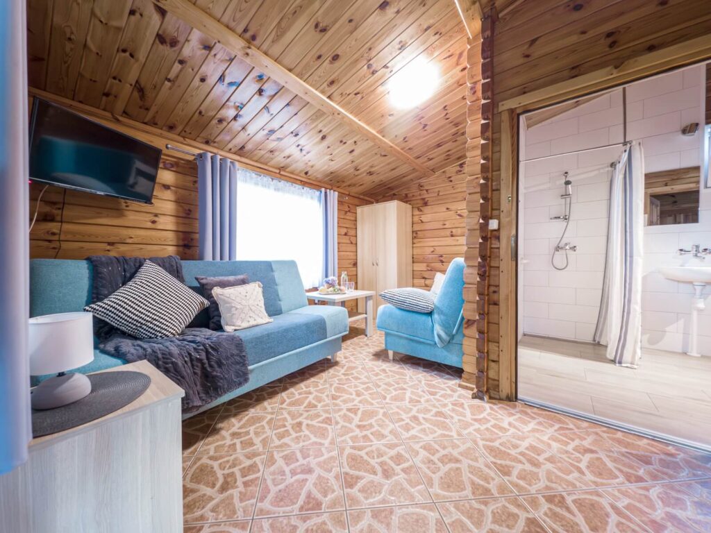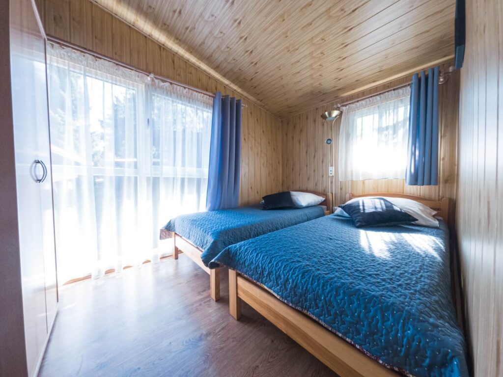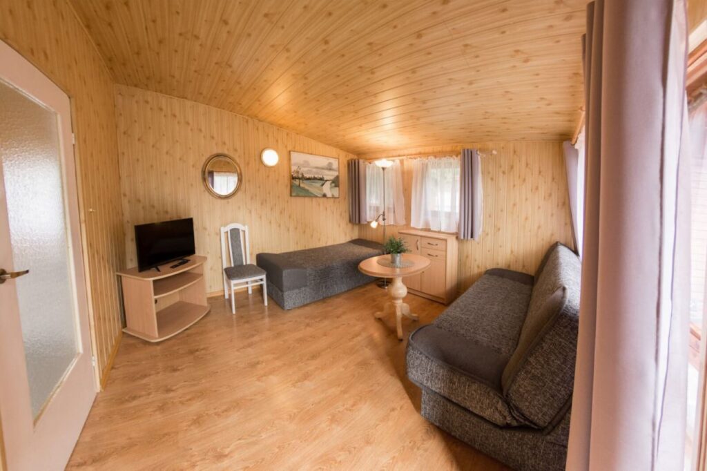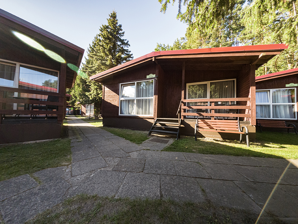 Jednorodzinne domki drewniane typu „Mikołajki”: dwupokojowe z łazienką, aneksem kuchennym z wyposażeniem (czajnik, lodówka, naczynia, sztućce), telewizorem LCD, sprzętem plażowym, tarasem oraz ogrodowym kompletem wypoczynkowym. Domki z podjazdami – dostępne dla osób poruszających się na wózkach inwalidzkich.